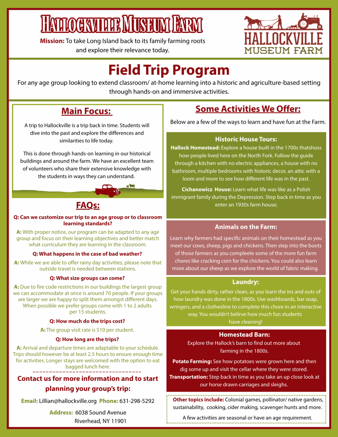 We have several standard educational programs that each can be tailored to suit the needs of particular groups. In addition, we can develop additional and specific programming for special events and purpose, and for students of all ages and abilities. Call 631-298-5292 to plan your visit or email Lillian Cowburn at lillian@hallockville.org.